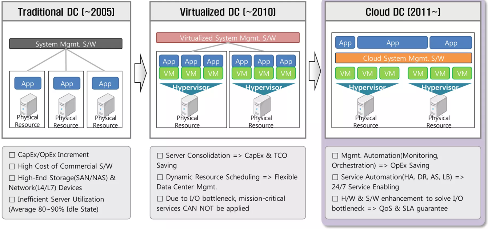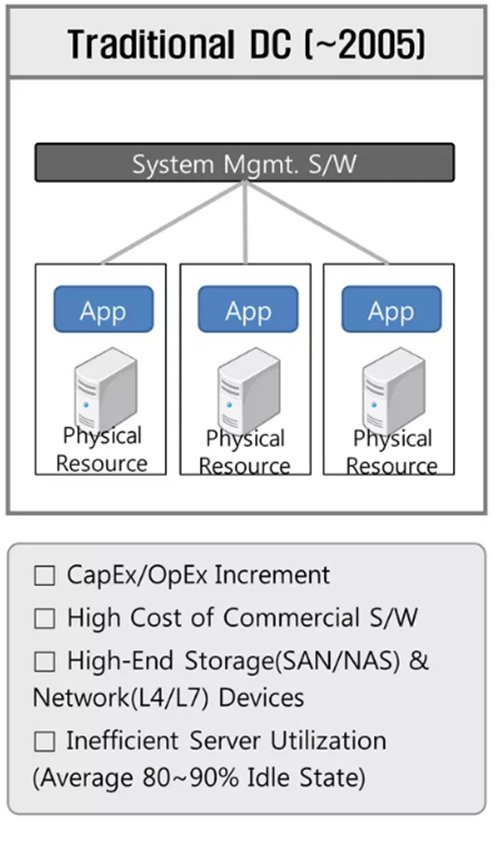 | 예 : 컴퓨터 한 대당 한 사람만 쓰는 PC방 | 예 : 각 컴퓨터를 VMware로 나눠 쓰는 PC방 | 예 : 모든 컴퓨터를 묶어 자동 배분되는 시스템 |