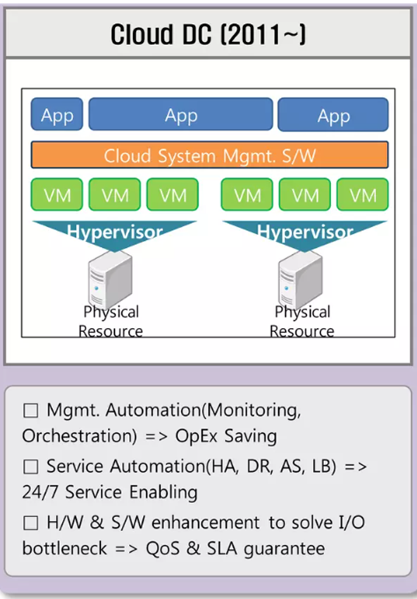 `Virtualized DC`는 한 대의 물리 서버가 가진 자원 한도 내에서만 VM을 생성할 수 있고, `Cloud DC`는 여러 대의 물리 서버 자원을 하나로 묶어, 자원을 통합해서 쓸 수 있습니다. 따라서 서버를 계속 붙이면 자원이 사실상 무제한처럼 확장할 수 있습니다.